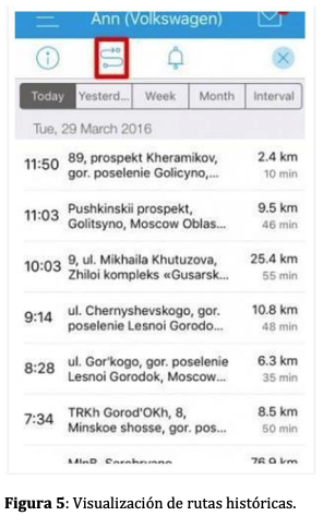 Consulte el historial de rutas para el período seleccionado. Podrá ver todos los trayectos registrados.